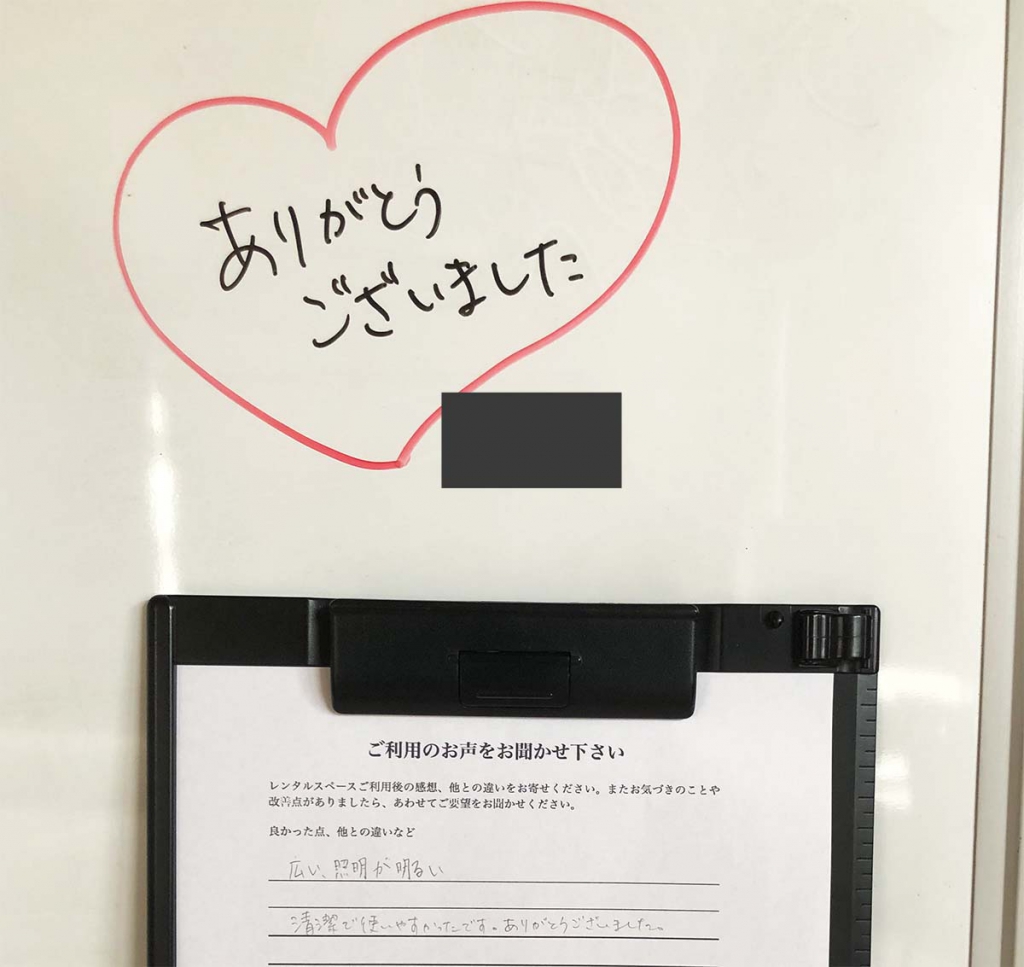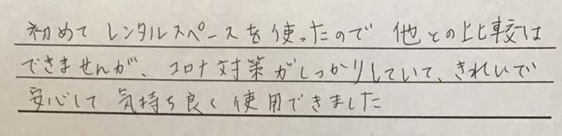 スペース利用の匿名さんより初めてレンタルスペースを使ったので、他との比較ができませんが、コロナ対策がしっかりしていて、きれいで安心して、気持ちよく使用できました。という、お声を頂きました。^ ^今後ともよりよいスペース運営をしてまいりたいと... -