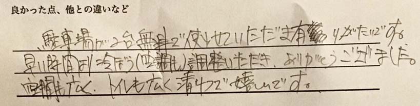 スペース利用のモモさんより「駐車場が2台無料で使わせていただき有りがたいです。早い時間より冷房(空調も)調整いただき、ありがとうございました。空間も広く、トイレも広く、清潔で嬉しいです。」という、お声を頂きました。とても嬉しいお声でした... -